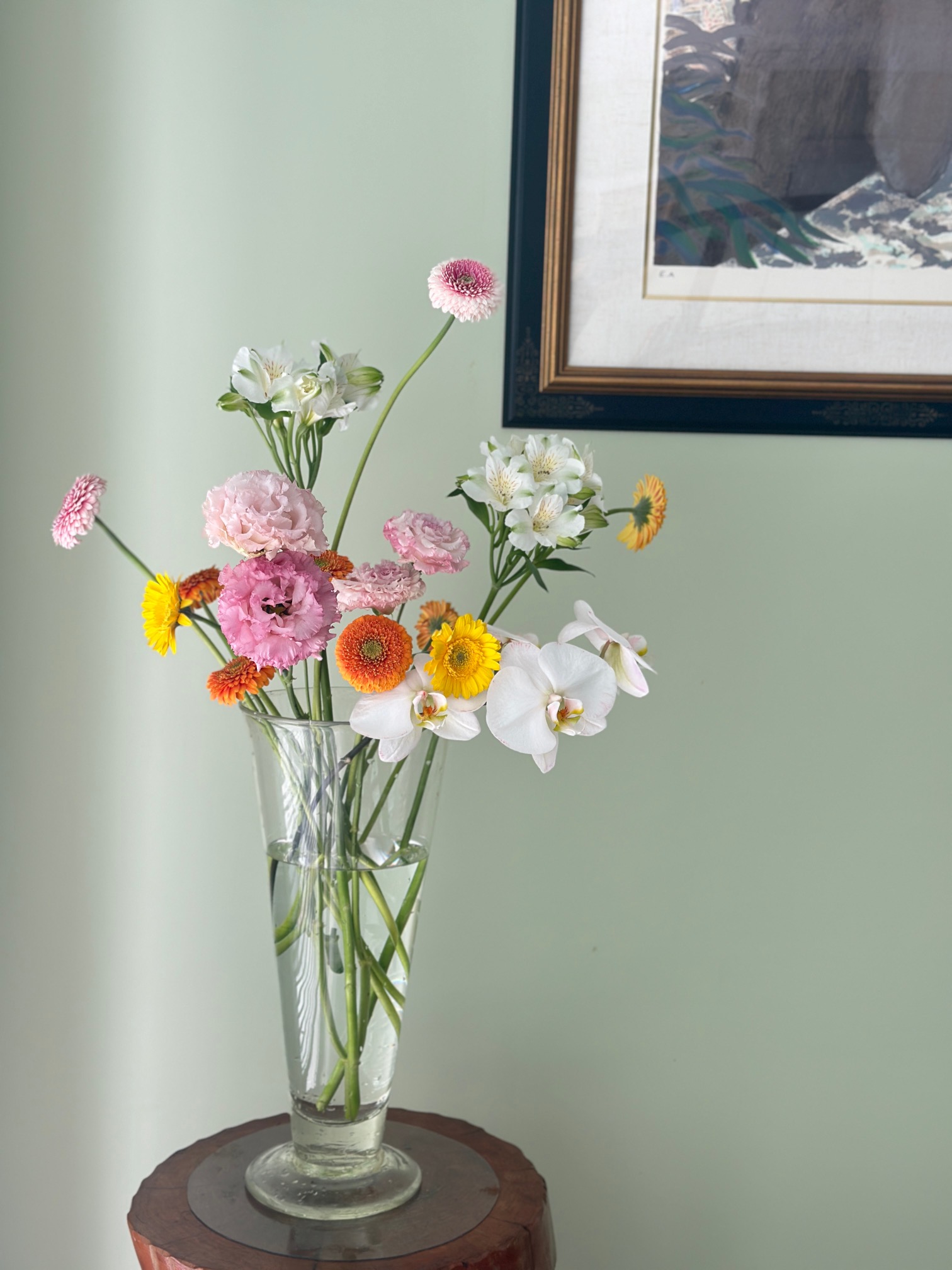見ているだけで元気をもらえる、陽気なガーベラを生けました。その真っ直ぐに上を向いて咲く姿から、